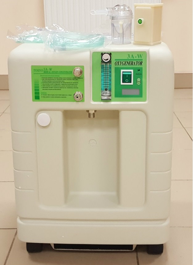 Koncentrator tlenu Koncentrator to urządzenie, wykorzystywane do dostarczania pacjentowi ciągłych dawek powietrza ze zwiększoną zawartością tlenu. Zwiększa to wydolność układu krążeniowo- oddechowego, dotlenia mięsień sercowy.