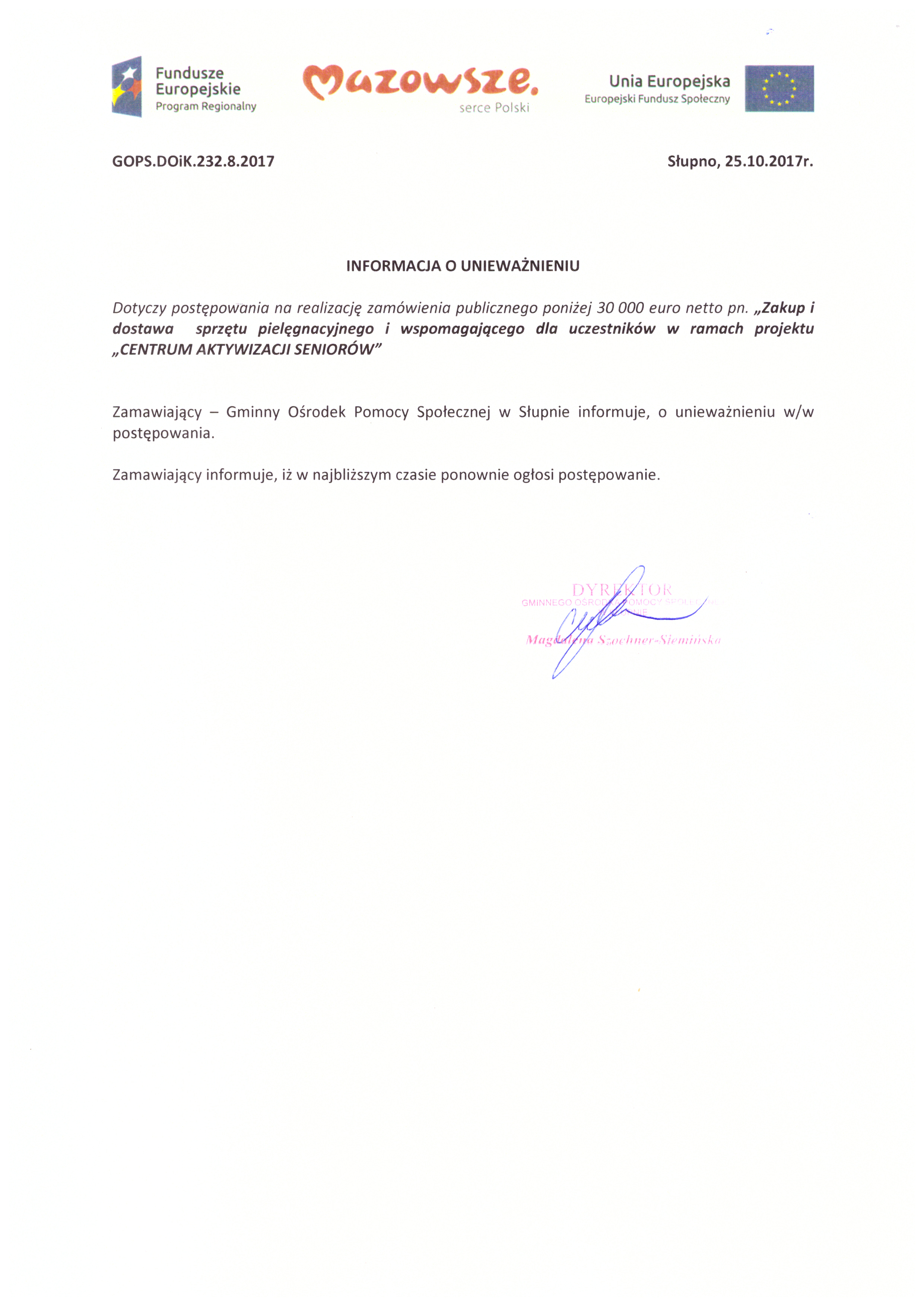 Zamawiający Gminny Ośrodek Pomocy Społecznej w Słupnie, 09-472 Słupno, ul. Warszawska 26a, tel. 24/261-91-78, zaprasza do składania ofert na realizację zadania: pn "Zakup i dostawa sprzętu pielęgnacyjnego i wspomagającego dla uczestników w ramach projektu "Centrum Aktywizacji Seniorów".