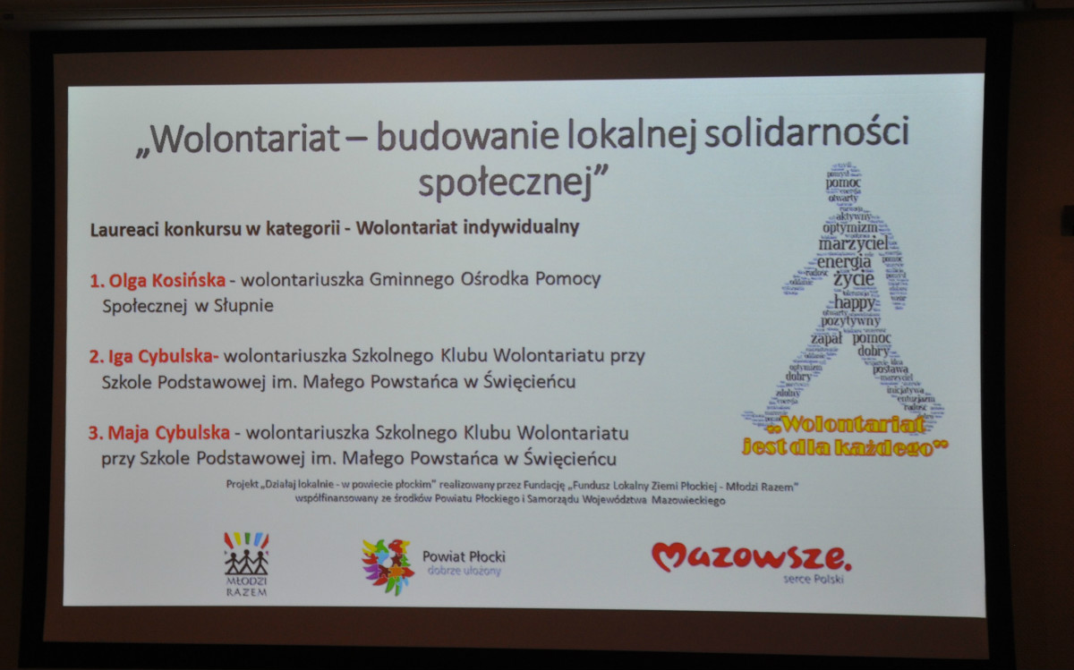 W dniu 7 grudnia 2018 r w Starostwie Powiatowym w Płocku podczas gali podsumowującej program „Działaj Lokalnie – w powiecie płockim” w wręczono nagrody laureatom konkursu pn. „Wolontariat – budowanie lokalnej solidarności społecznej” współfinansowanego ze środków Samorządu Województwa Mazowieckiego i Powiatu Płockiego.